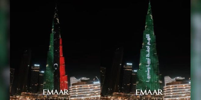 في حين كانت هناك رسالة على واجهة البرج المضيفة، تقول: “من أهل الإمارات إلى ليبيا وشعبها الشقيق.. قلوبنا وعقولنا معكم، اللهم احفظ ليبيا وشعبها”.