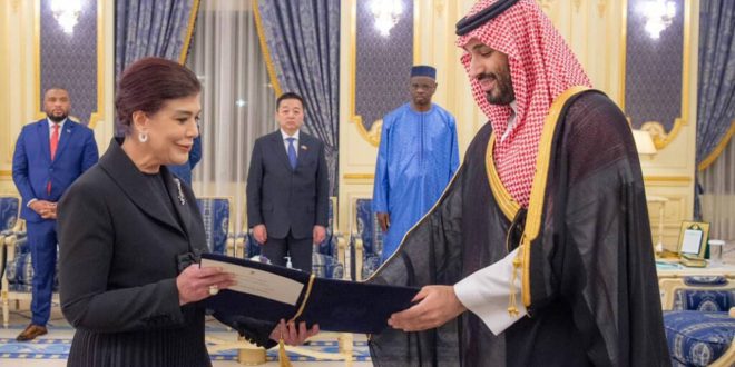 تداول نشطاء على مواقع التواصل الاجتماعي صور سفيرة العراق في السعودية، صفية طالب السهيل، خلال تقديم أوراق اعتمادها كسفيرة، لولي العهد السعودي الأمير محمد بن سلمان أثناء مراسم التسليم الرسمية في قصر السلام، الأربعاء.