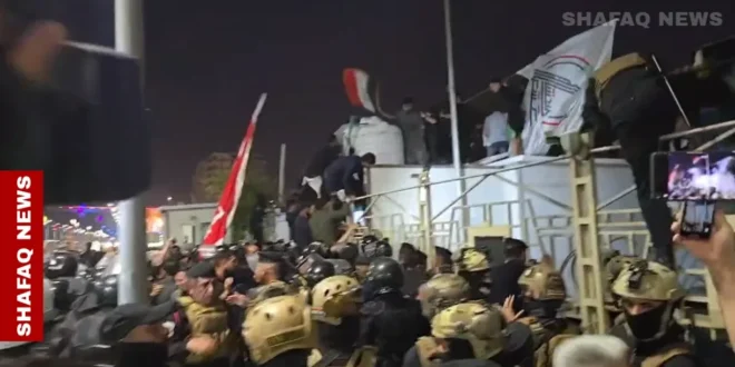 من المتظاهرين، مساء الثلاثاء، القنصلية الكويتية في البصرة، وسط استخدام القوات