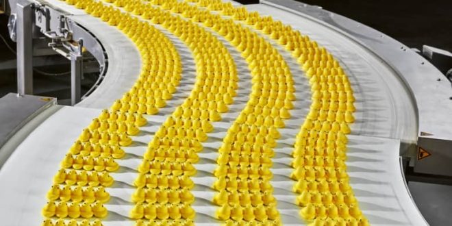 مشهد لحلوى المارشميلو “الخطمي” المصنوع على شكل فراخ قبل تغليفها في بنسلفانيا.Credit: Photographs by Christopher Payne