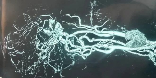 تلويني (ملون) للدماغ، كشف عن وجود "أمّ دم" في الشريان الرابط الأمامي.