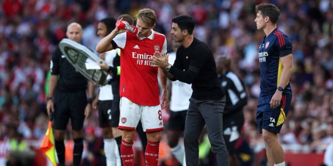وظهر أرتيتا (41 عامًا) وهو يشارك لاعبيه التدريب، قبل أن يقوم بتمرير الكرة بين قدمي لاعبه أوديغارد، وهي حركة مهارية يطلق عليها جمهور لعبة كرة القدم تسمية “كوبري”، ثمّ انتابه فرحة عارمة.