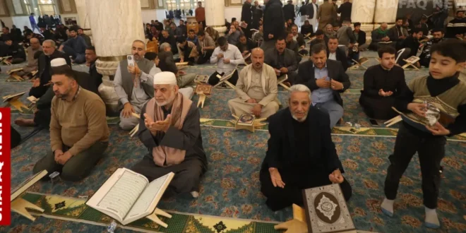 و تمتلئ أروقة المسجد بالمصلين الذين ينهمكون بتلاوة كتاب الله في أجواء يختلط فيها صوت الترتيل بخشوع القلوب، لتتحول ليالي رمضان في مسجد الكوفة إلى مشهد إيماني نابض بالحياة والسكينة.