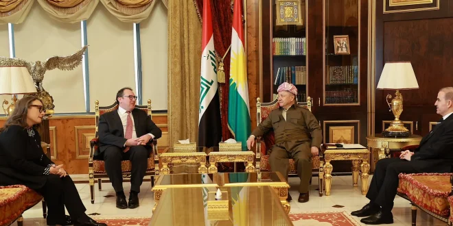 وذكرت السفارة الأميركية في بيان نشرته على منصة “أكس”، أن القائم بالأعمال جوشوا هاريس والقنصل العام ويندي غرين، جددا خلال لقائهما مع الزعيم الكوردي مسعود بارزاني، “التأكيد على التزام الولايات المتحدة الراسخ بدعم عراقٍ ذي سيادة ومستقر ومزدهر، وكذلك على شراكة قوية ودائمة مع إقليم كوردستان العراق”.