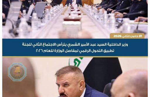 وزير الداخلية السيد عبد الأمير الشمري يترأس الاجتماع الثاني للجنة تطبيق التحول الرقمي لمفاصل الوزارة للعام 2026 1 فبراير، 2026 عربي و دولى اضف تعليق 55 زيارة مقالات مشابهة بعد إصابة ضرغام.. نشر سيطرات وتشكيل لجان تحقيق ميدانية في بابل ساعة واحدة مضت بعد إصابة ضرغام.. نشر سيطرات وتشكيل لجان تحقيق ميدانية في بابل ساعة واحدة مضت انحسار تدريجي للأمطار اليوم.. وتوقعات بموجة جديدة تشمل أغلب مدن العراق السبت المقبل ساعة واحدة مضت شاركها Facebook Twitter Stumbleupon LinkedIn Pinterest