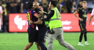 أظهرت لقطات مصورة اقتحام أحد المشجعين أرض الملعب، للقاء اللاعب ليونيل ميسي، في أعقاب مواجهة نادي إنتر ميامي و نظيره لوس أنجلوس، ضمن منافسات الدوري الأمريكي لكرة القدم، فجر الاثنين. وتبيّن أن مشجع اقتحم المستطيل الأخضر للقاء النجم الأرجنتيني، لكنّ الحارس الشخصي لميسي ركض مسرعاً وأبعده على الفور، قبل أن يخرجه …
